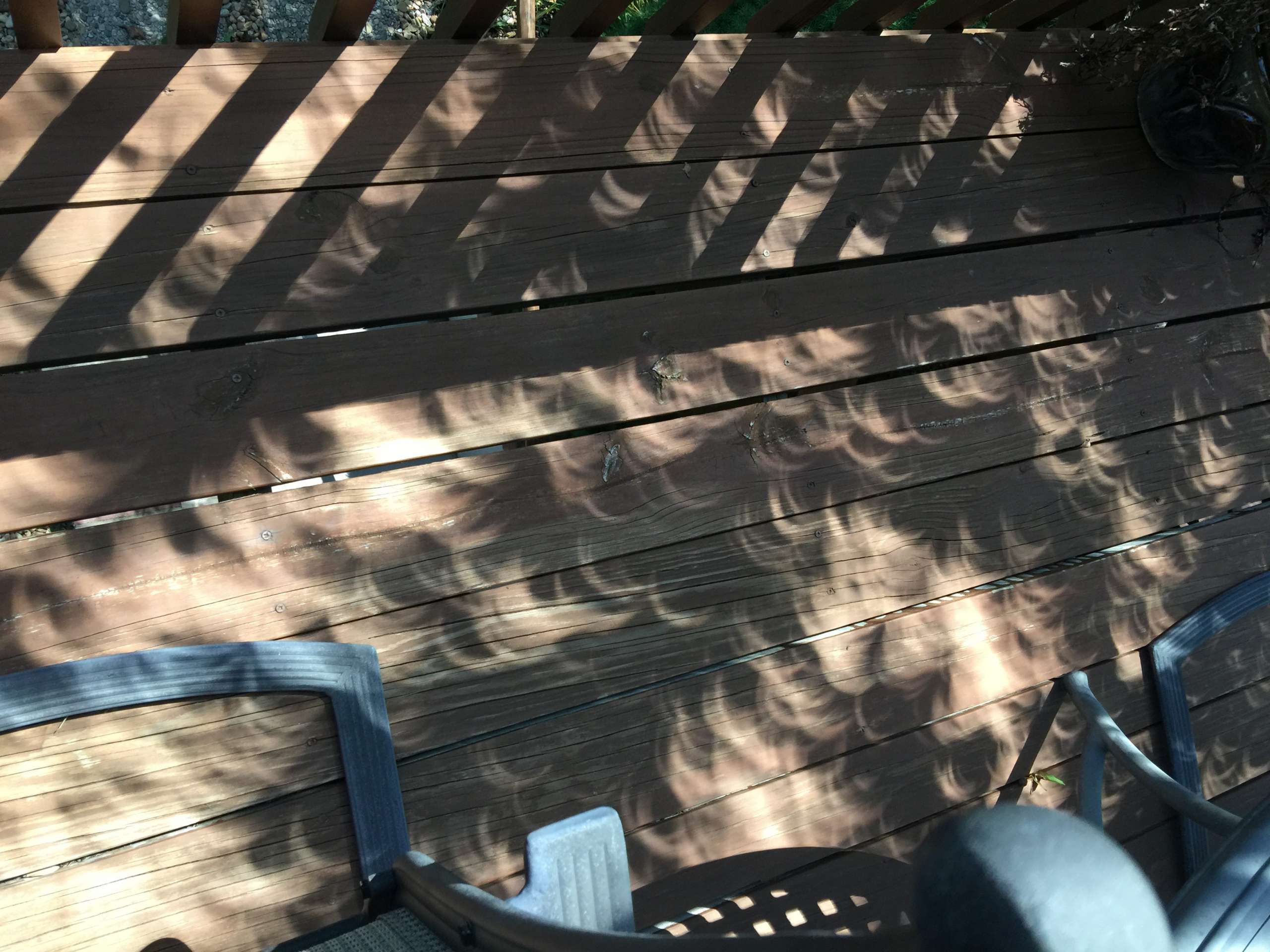 Here’s a picture of the leaves on my deck, which, during the Eclipse, turned into multiple eclipse shapes as the moon moved across the sun. That was definitely not something I was expecting.